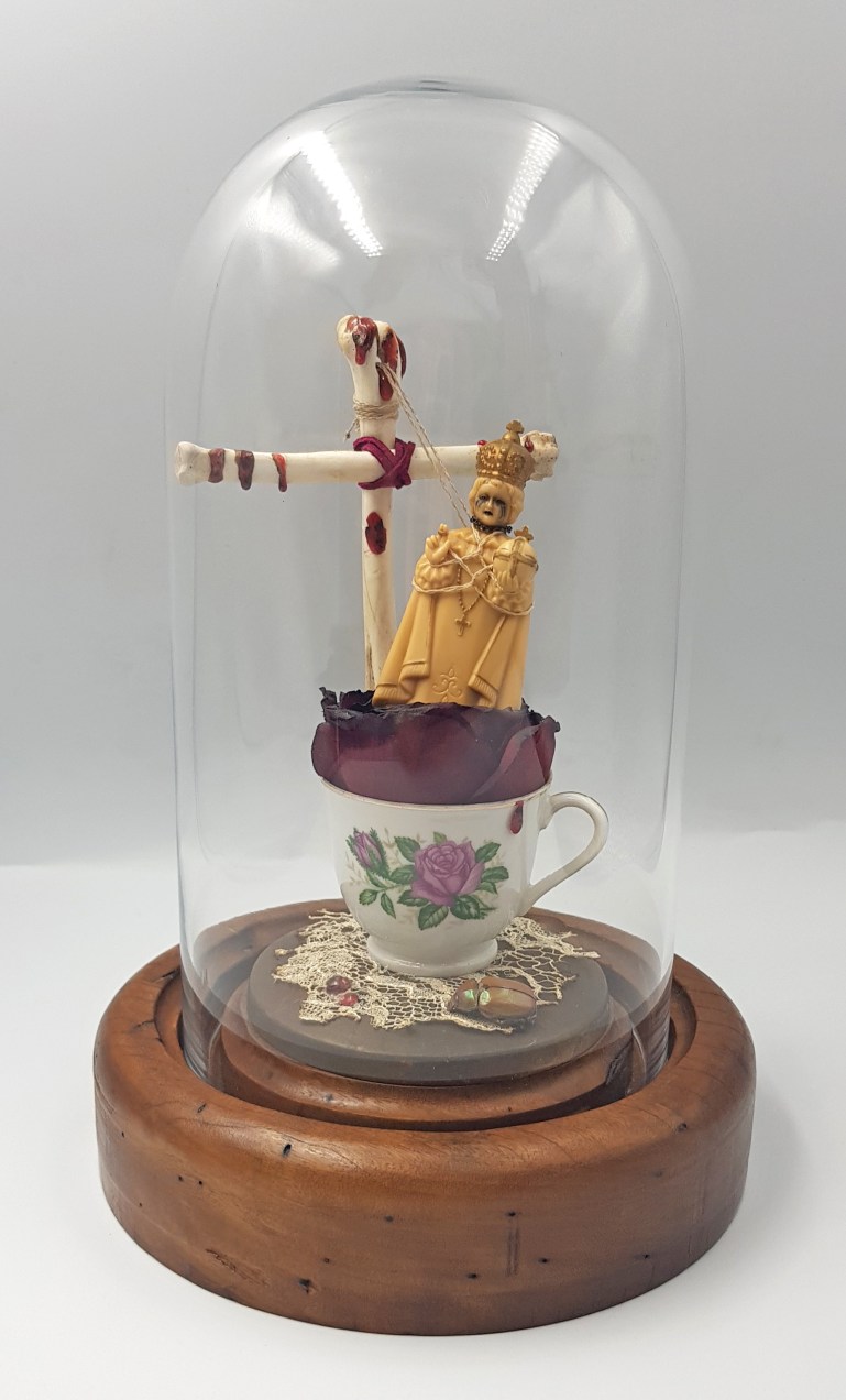 Plastic figure, fox bones, faux rose, antique teacup, antique lace, Christmas Beetle, wax, solid wooden base Both comments and trackbacks are currently closed. Altar Boy SOLD