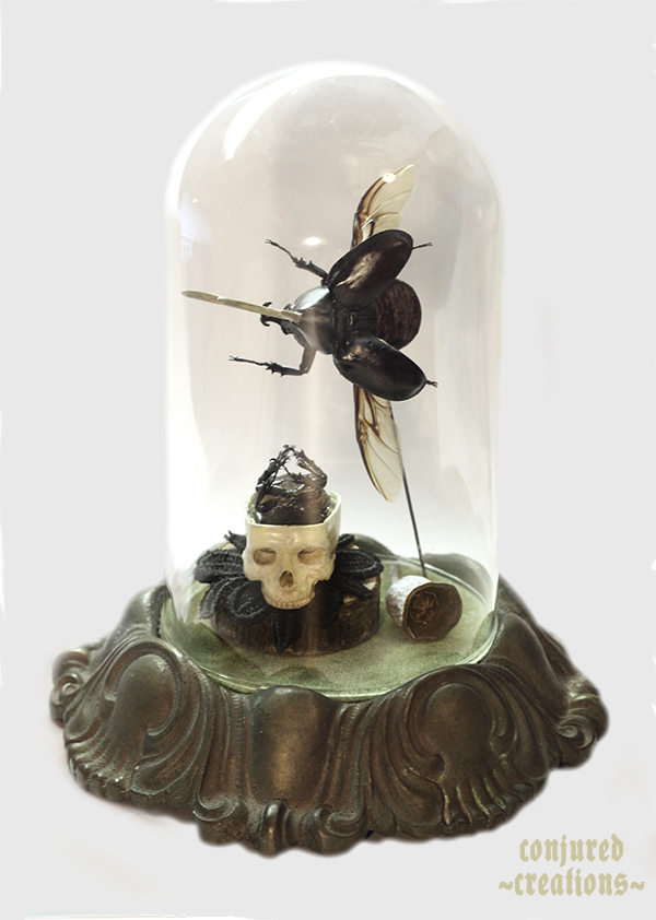 Male Flying Rhino Beetle with Metal Antler Horn, Female Rhino Beetle, Replica Skull, Gumnut, Lace, Velvet, Wood, on a Antique Brass Stand. Both comments and trackbacks are currently closed. Left for Dead