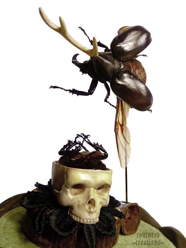 Both comments and trackbacks are currently closed. Left for Dead Detail (detail) Rhino Beetles, metal horn, faux skull, wood, textile, gumnut