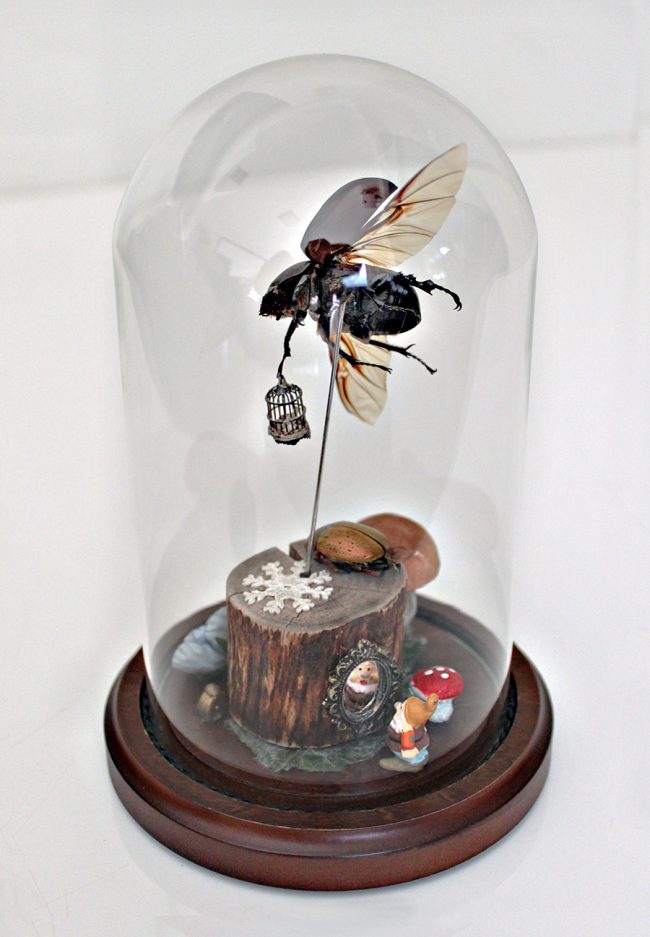 (back) Rhino beetle, metal birdcage, wood, miniatures, textiles, dwarf, faux mushroom, paper flower Both comments and trackbacks are currently closed. Flying Free SOLD