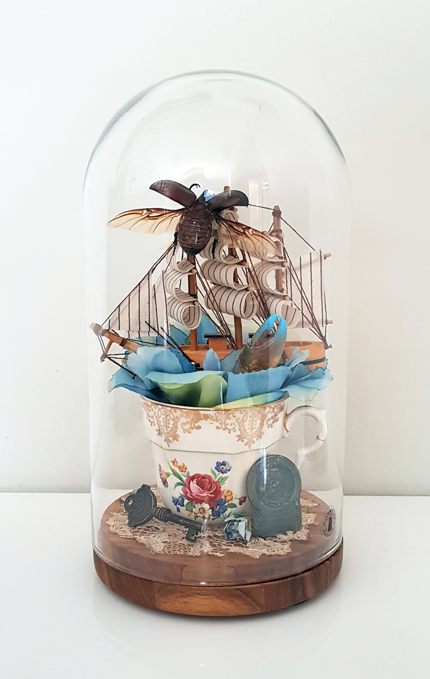 Made by Lucia Mocnay in 2018. 1 of a series of 5 Both comments and trackbacks are currently closed. Tales of the High Sea, Tea Clipper Dome Antique Teacup with 24 carat gold building, antiques, lace, wooden ship, stag beetle, faux flower.