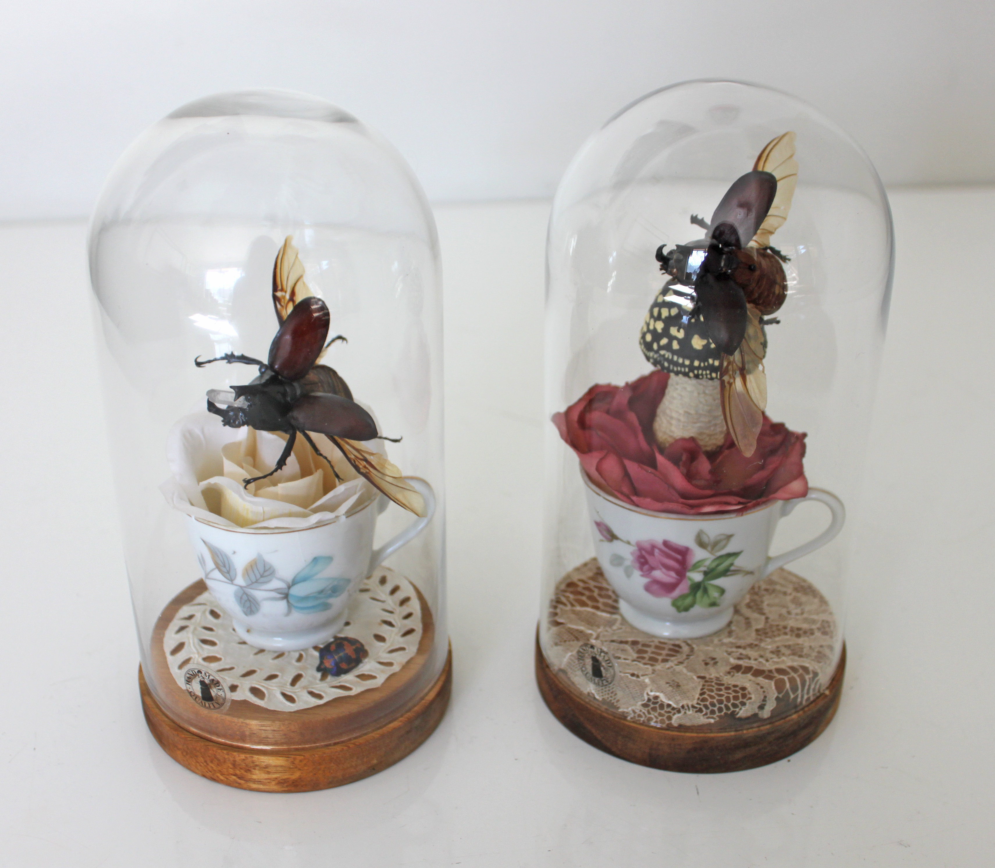 Left: Stag Beetle with quartz crystal horn, faux rose, antique teacup, antique lace, beetle, on oak base.