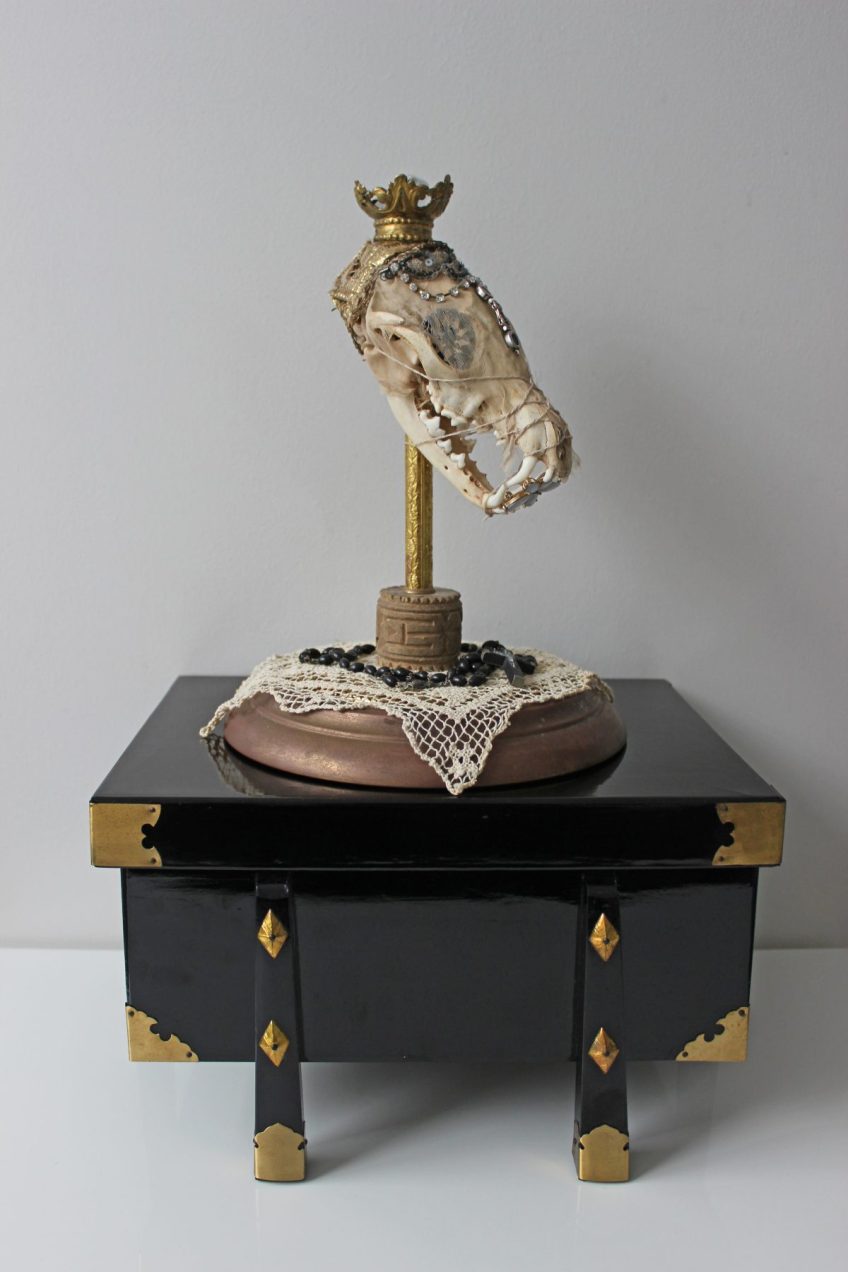Both comments and trackbacks are currently closed. St Apollonia Fox Skull, Victorian era dress remnants, antique jewels, relics from Salzburg’s castle, quartz crystal, antique rosary beads, antique lace, mixed media