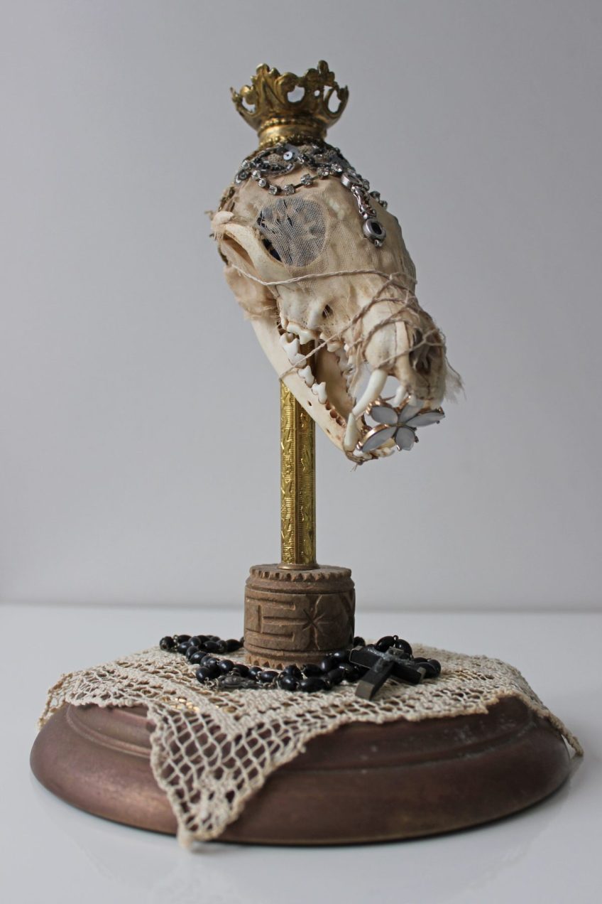 Both comments and trackbacks are currently closed. St Apollonia Fox Skull, Victorian era dress remnants, antique jewels, relics from Salzburg’s castle, quartz crystal, antique rosary beads, antique lace, mixed media